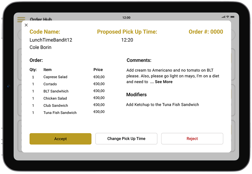 Here you can see how the restaurant would go about about moving through the “Needs Approval” tab. The user is able to view the whole order, accept or reject the order, and contact customer support.