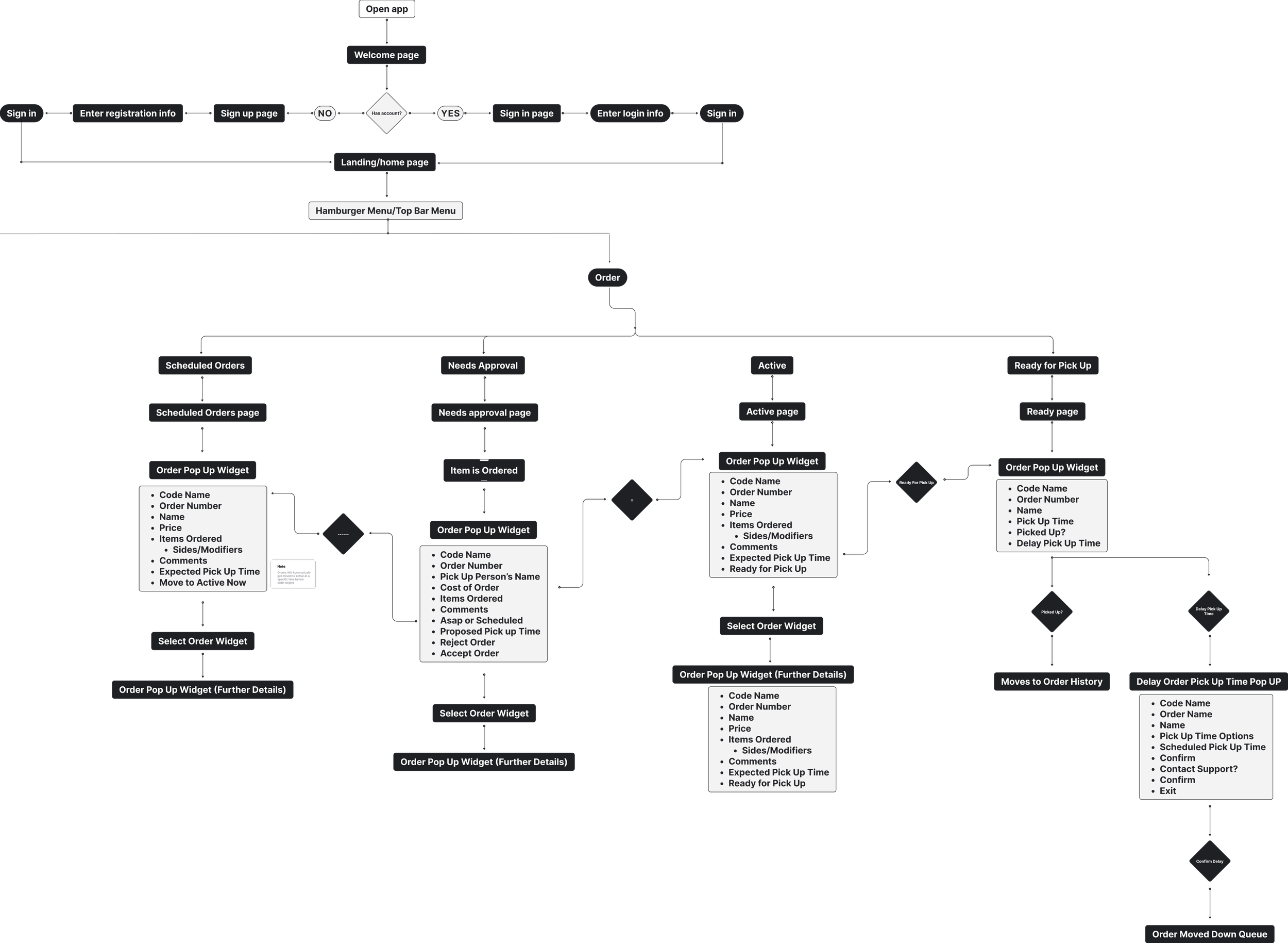 The first part of the flow that we constructed was the for the orders side of the application. Here the main focus was to have everything be well organized while also being laid out in front of the user so that they were able to move quickly through each of the sections needed to move a order from start to finish. It was very important to nail down a good flow for the orders side as it is the main feature that the restaurant will be interfacing with the most.