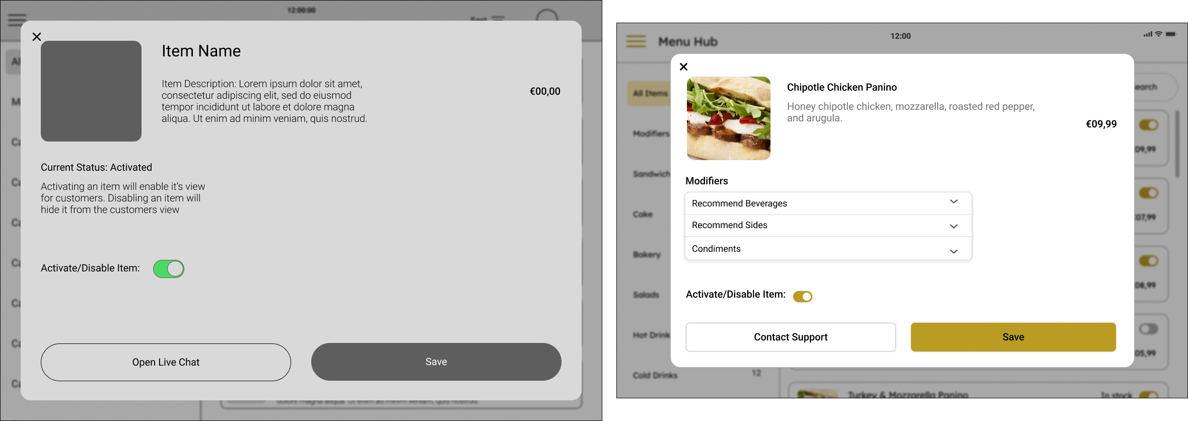 Finally the “Menu” tab is where the restaurant can see what they have on their current menu and then toggle if the item is available or not. The restaurant can Alsop see what modifiers are available per item they have on their menu.