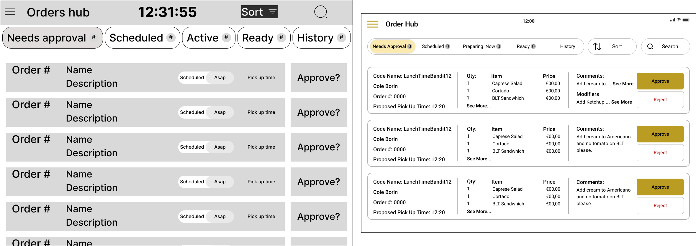 The first page in the orders hub that was designed was the “Needs Approval” page. This is the center for all orders coming in. From here the restaurant is able to view the orders that are coming in and also preview what the order is. It also serves as the section where the restaurant can see what the preposed pickup time is and change it if needed.