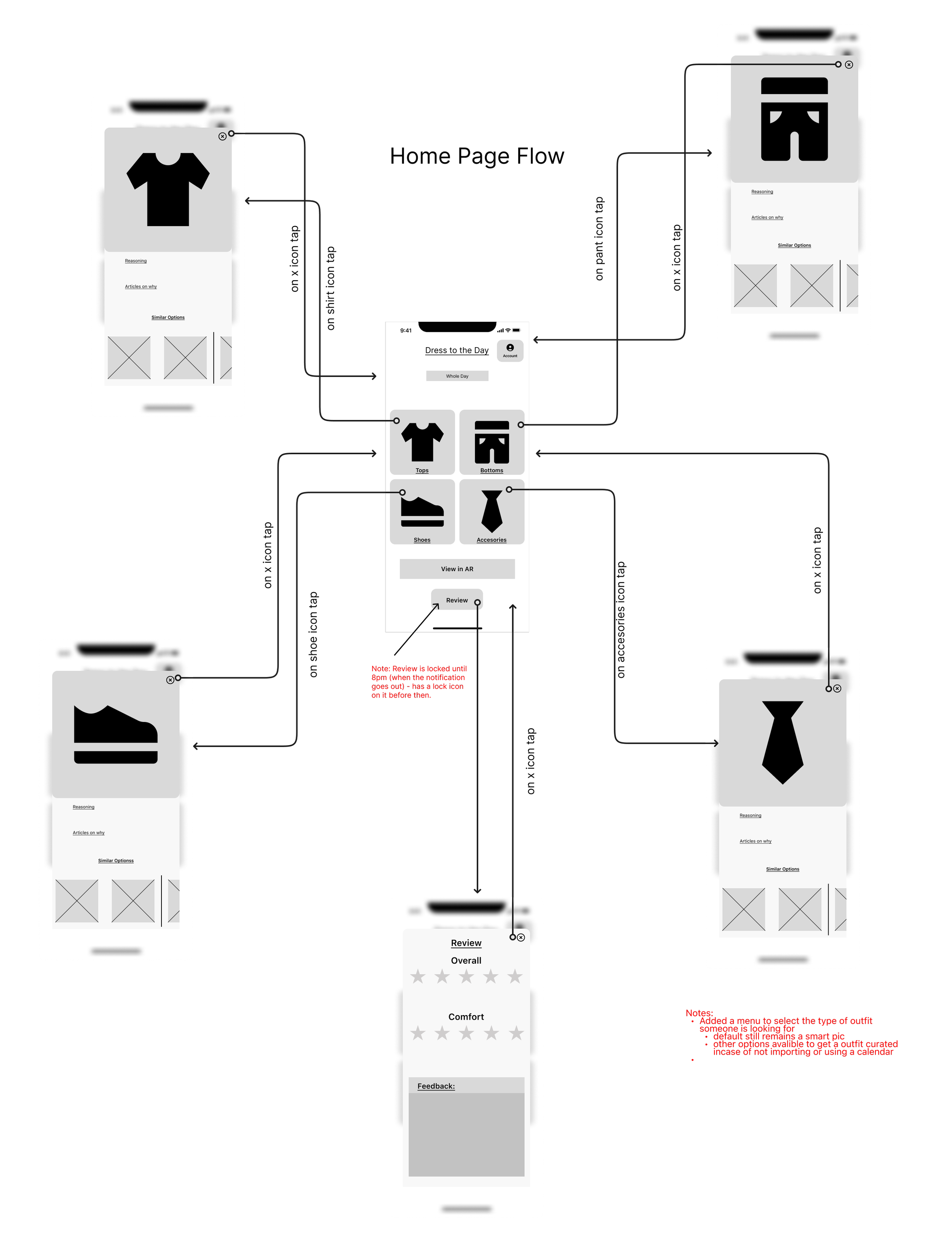 Off of the “Homepage” flow, pictured below, you see that there are options to enlarge each of the clothing items with their reasonings and alternate options. You also see the option to view the outfit in AR and review the outfit.