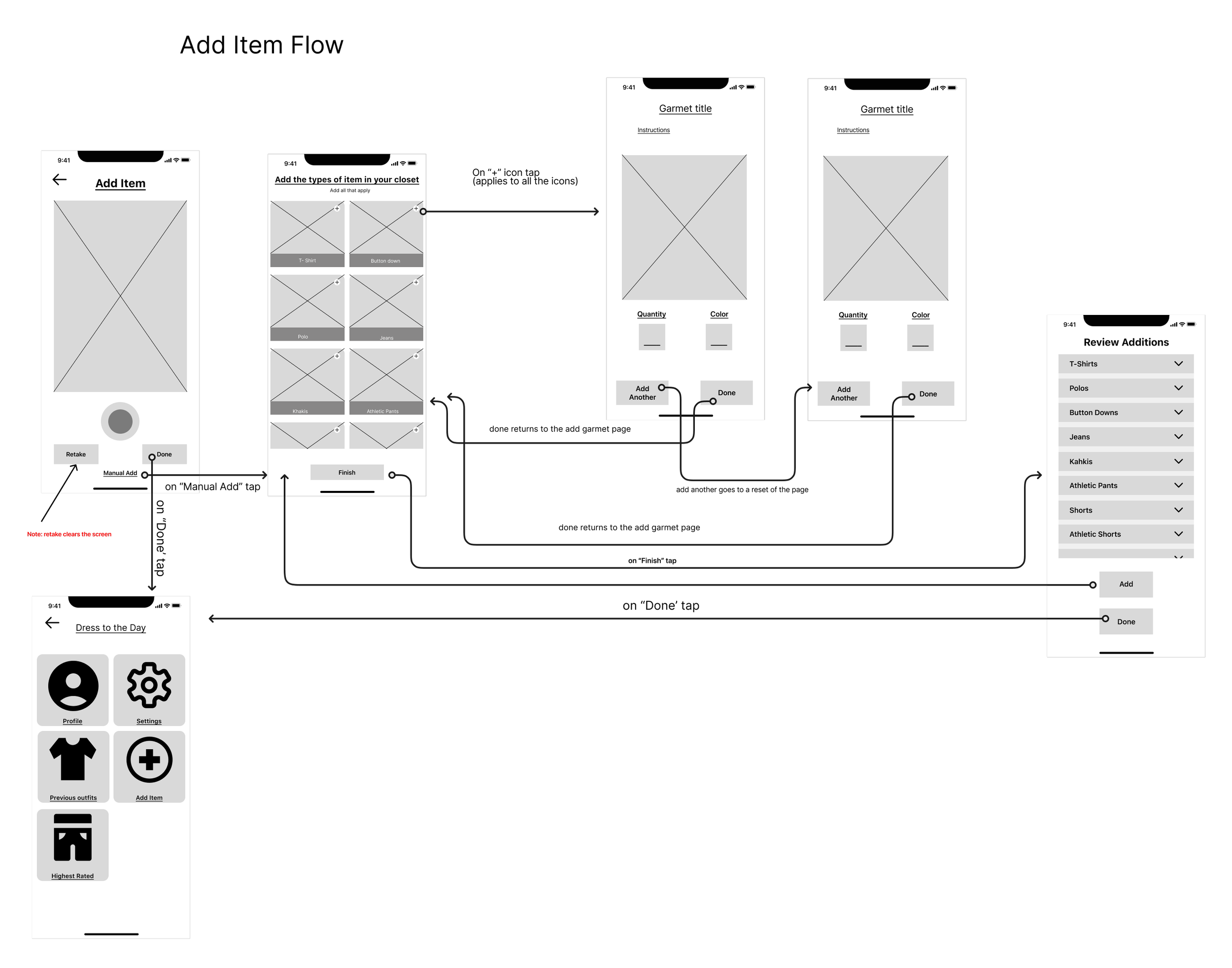 The “Add Item” flow is a very important one. If a user acquires a new piece of clothing they need a way to add it to their closet within Let’s Get Dressed.